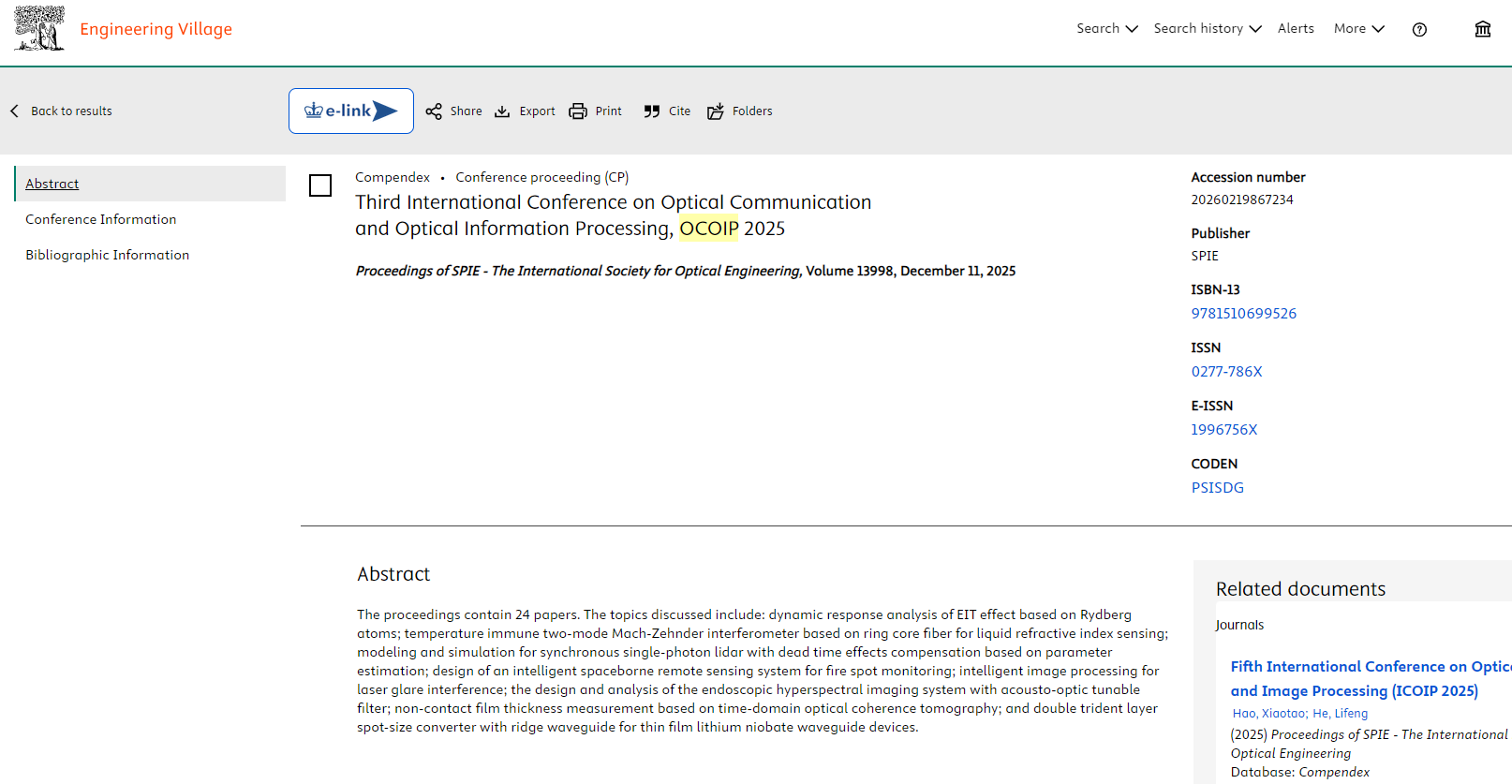 OCOIP2026 accepted and presented papers will be published by SPIE (ISSN: 0277-786X), submitted to Ei Compendex, Scopus, Web of Science Conference Proceedings Citation Index, and other scholarly indexes, to ensure maximum awareness of the Proceedings.